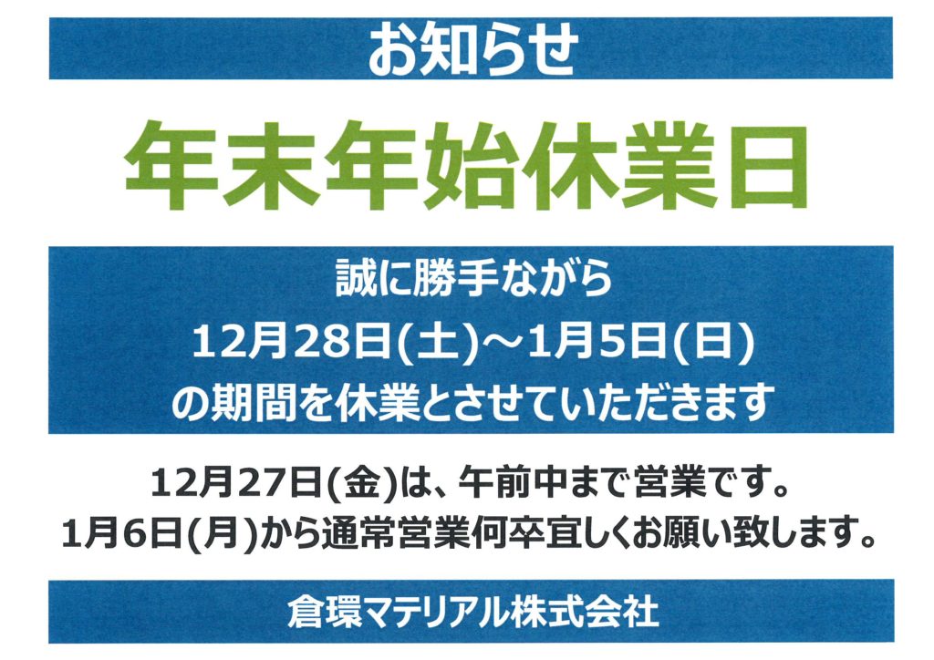 年末年始営業日・休業日のお知らせ